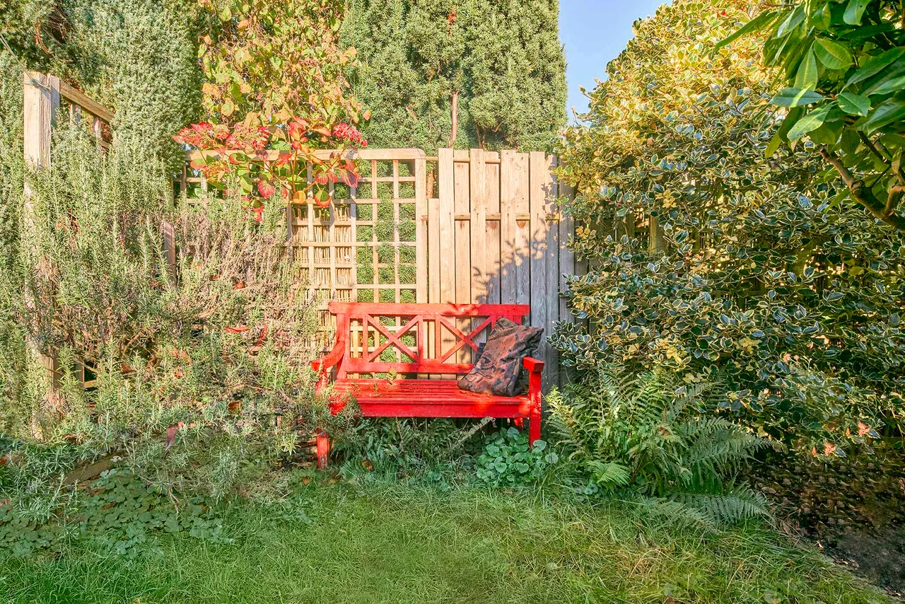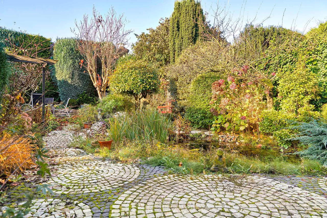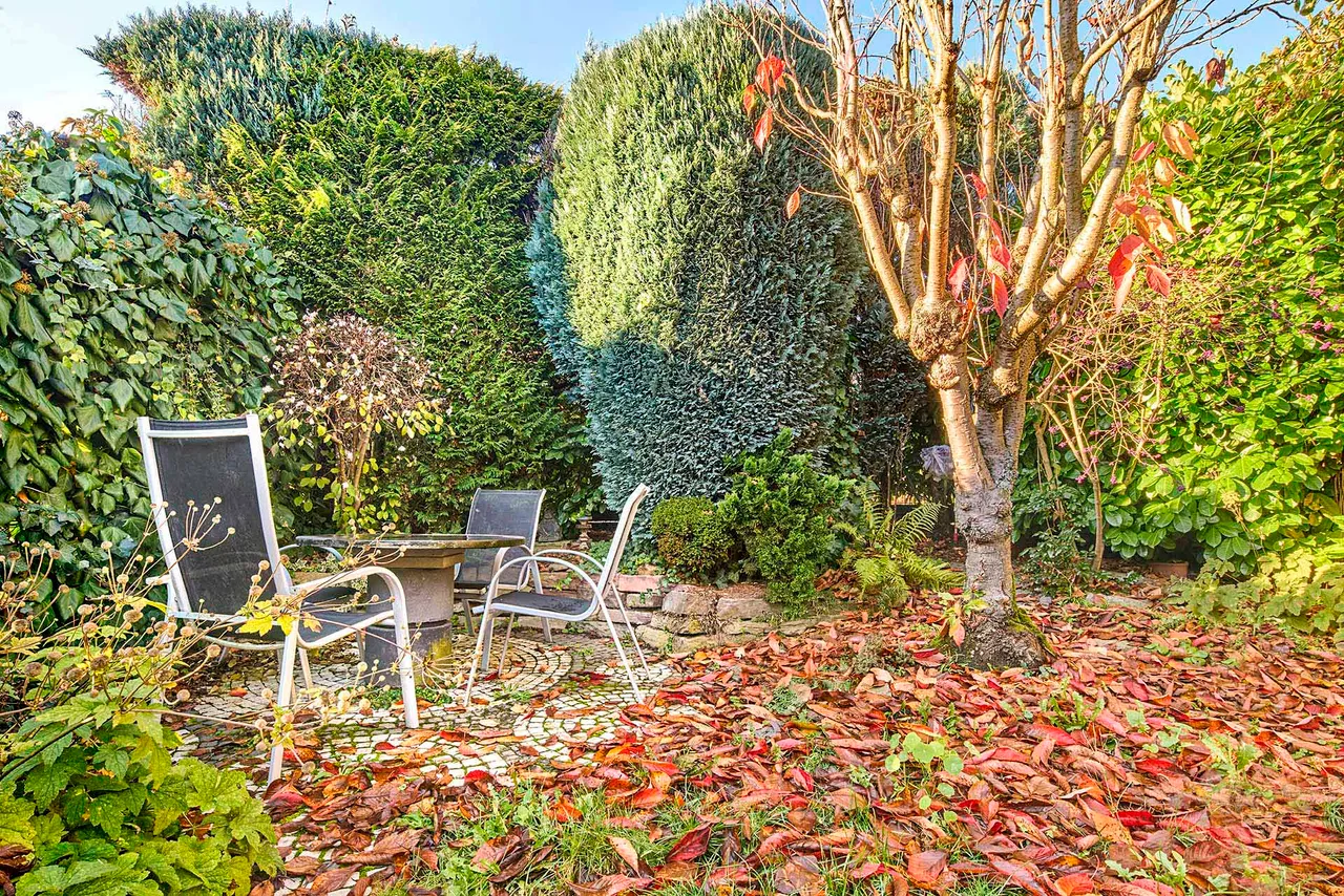 Der liebevoll gepflegte Außenbereich dient als geschützter Rückzugsort im Grünen. Die ansprechende Gestaltung schafft eine ruhige und private Atmosphäre, ideal, um die Natur zu genießen und entspannte Stunden im Freien zu verbringen.