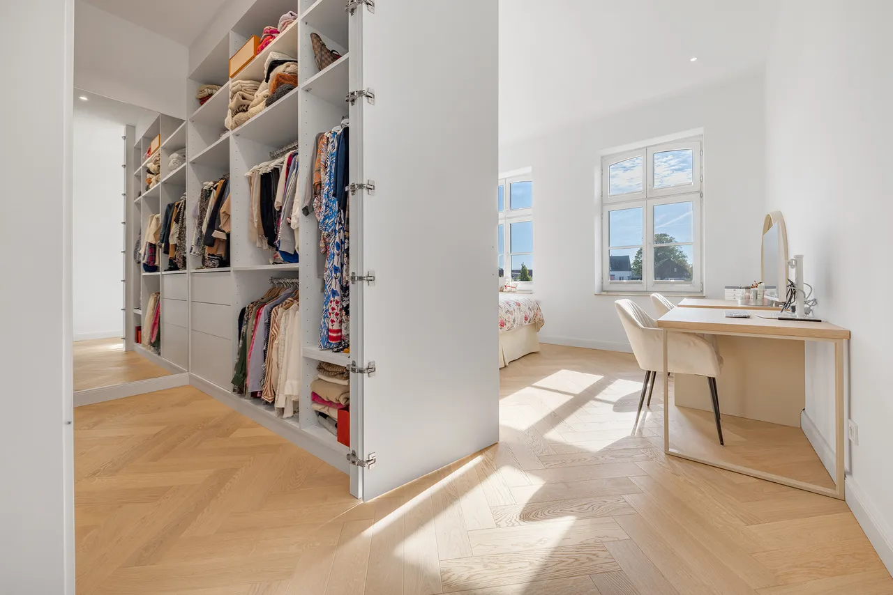 Auf der einen Seite liegt der Wohnbereich. Hier bildet das großzügige Wohnzimmer den Mittelpunkt des Zusammenlebens. Direkt gegenüber, als ruhiger Rückzugsort, befindet sich das Elternschlafzimmer. Es überzeugt mit einem maßgefertigten Ankleidebereich und einem eleganten Schminktisch.