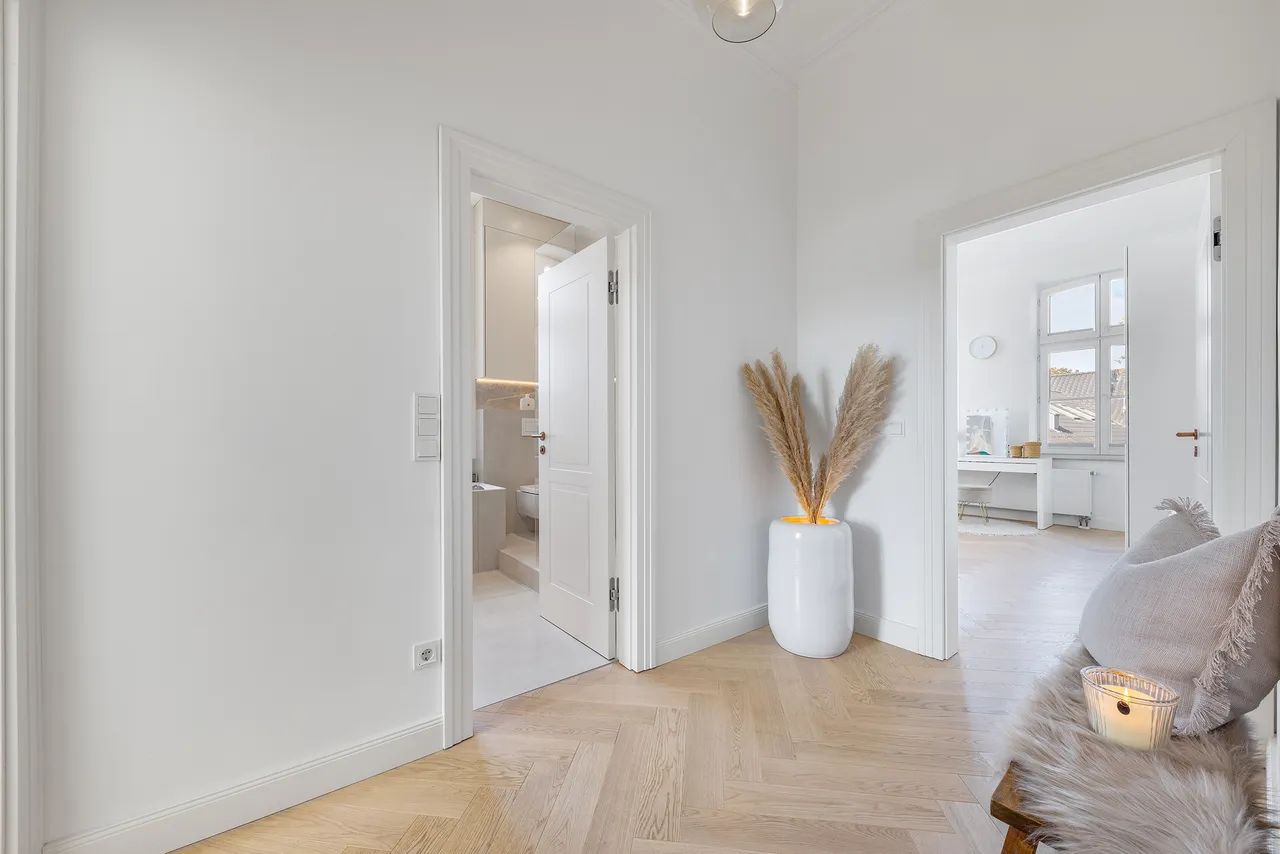 Erst 2024 wurde diese Wohnung für rund 200.000 Euro auf ein Niveau gebracht, das höchsten Ansprüchen genügt. Von sorgfältig gespachtelten Wänden (Q2) mit Fliestapete über elegante Stuckleisten bis zu den hochwertigen Simonswerk-Türen hier zeigt sich ein klares Bekenntnis zu Qualität und Langlebigkeit.