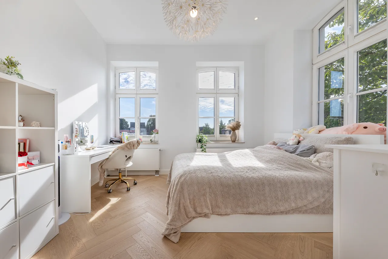 Vollkommen separat davon, am anderen Ende der Diele, liegt der Kinderbereich. Er bietet zwei helle Zimmer, eines davon mit eigenem, integrierten Duschbad. Das hochwertige Hauptbad, ebenfalls in diesem Trakt, ist mit Wanne und begehbarer Dusche modern und komfortabel ausgestattet.