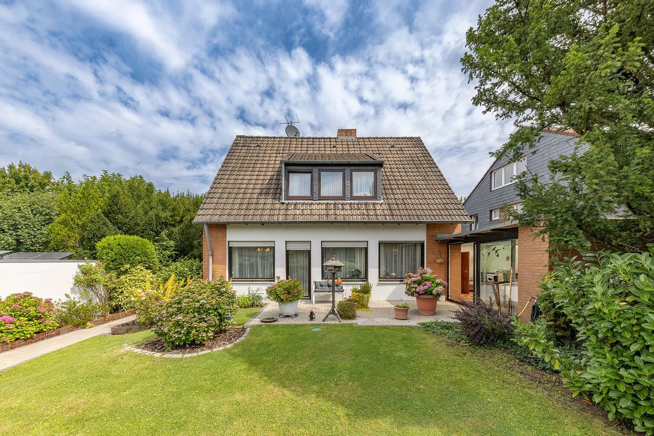 Das Haus bietet eine Wohnfläche von ca. 109 m², die sich auf Erd- und Obergeschoss verteilt. Das Erdgeschoss verfügt über ein großzügiges Wohnzimmer mit offenem Übergang in das Esszimmer. Von hier aus gelangen Sie in die Küche und in den ca. 20 m² großen Wintergarten, der mit einem gemütlichen Kamin ausgestattet ist. Angrenzend an den Wintergarten befindet sich ein Freisitz mit Blick in den liebevoll angelegten Garten.