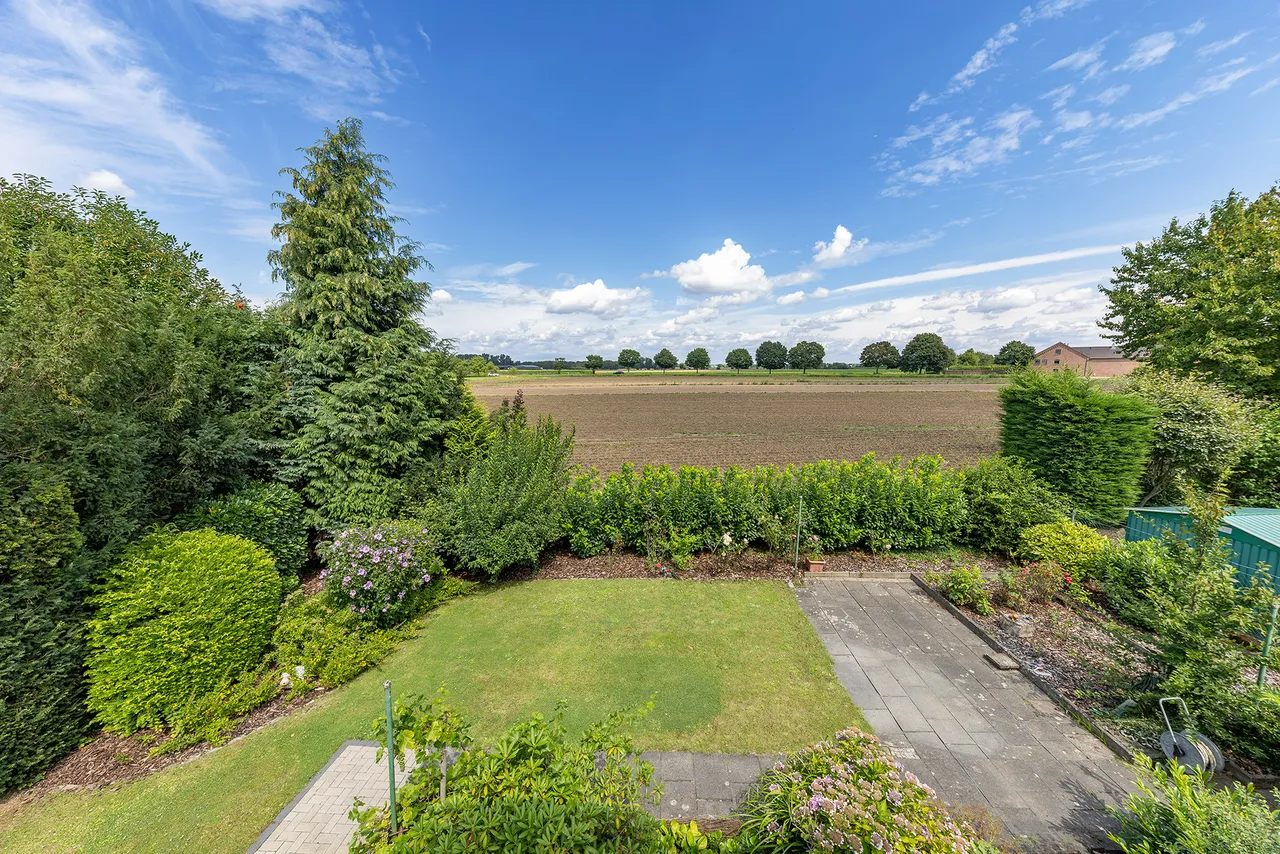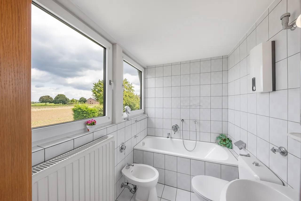Im Obergeschoss sind drei Schlafzimmer, eines davon mit Balkon, sowie ein Badezimmer untergebracht. Aus dem Obergeschoss genießen Sie einen sehr schönen und unverbaubaren Blick über die angrenzenden Felder.