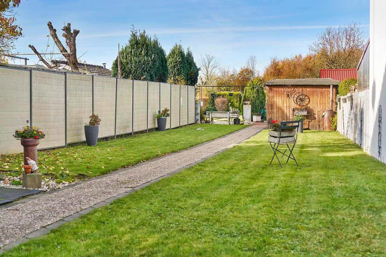 - Garage mit Geräteschuppen, Schwingtor, Strom