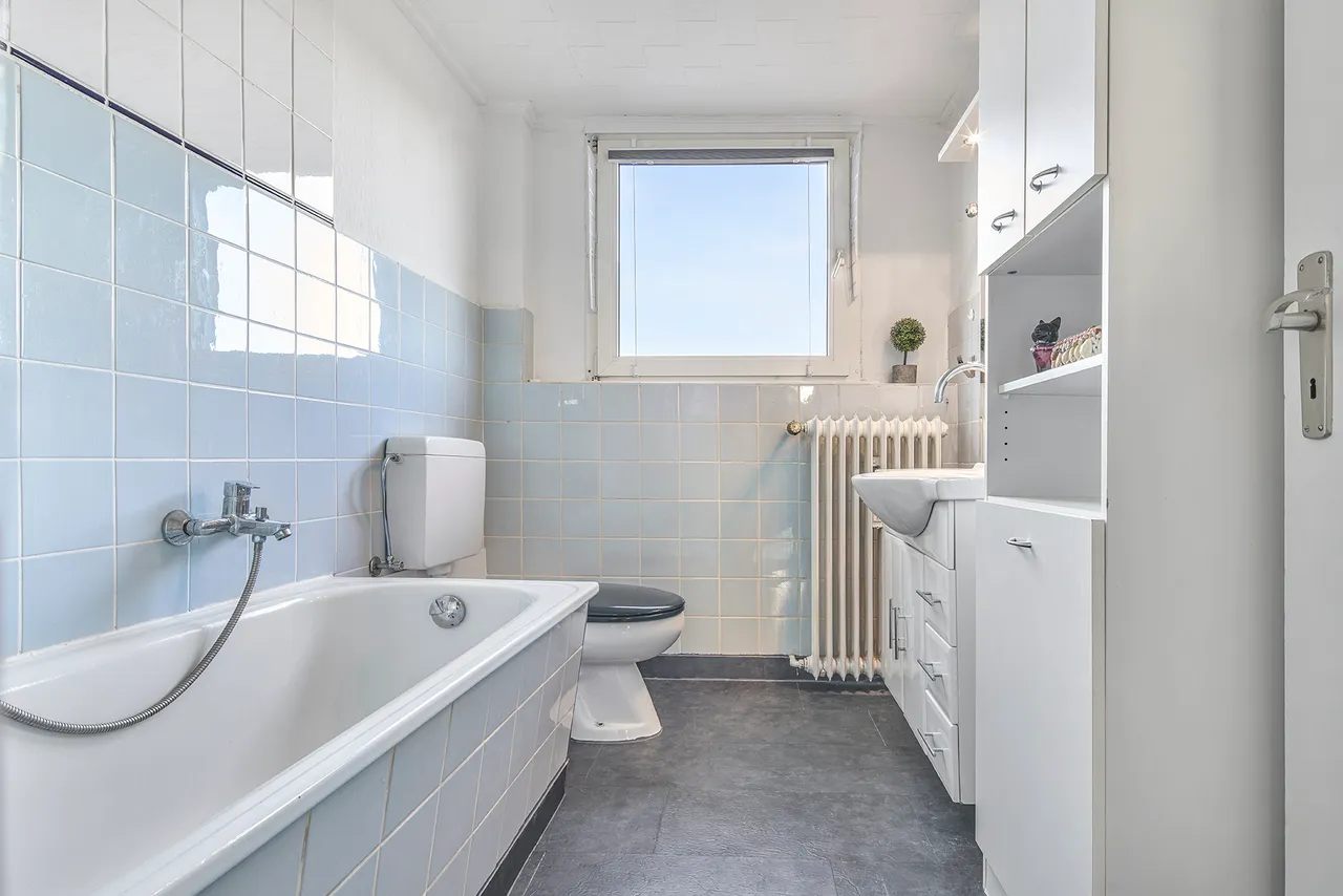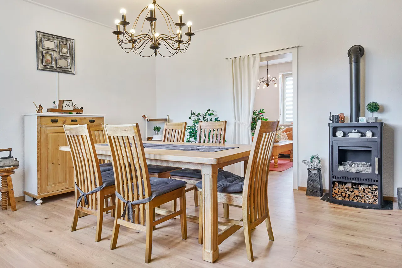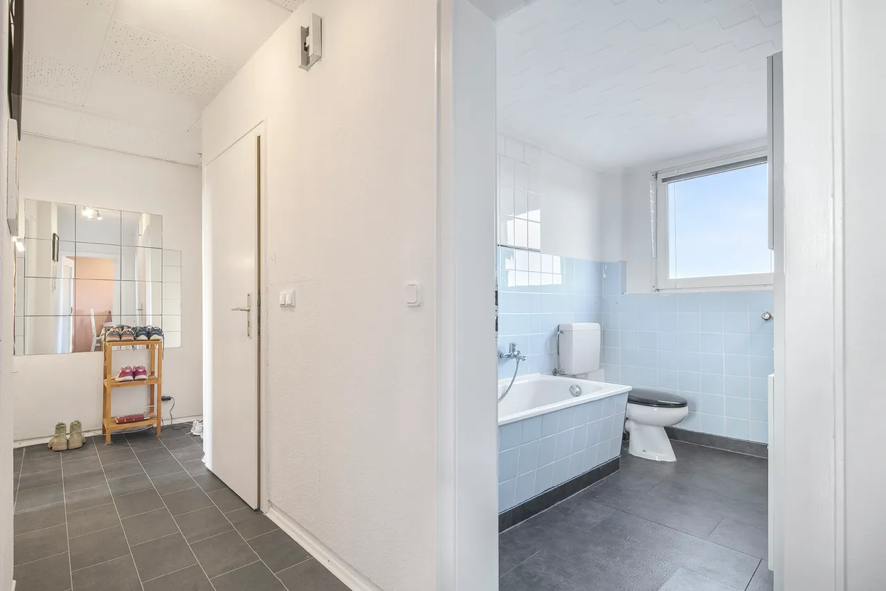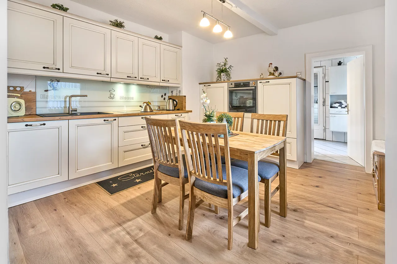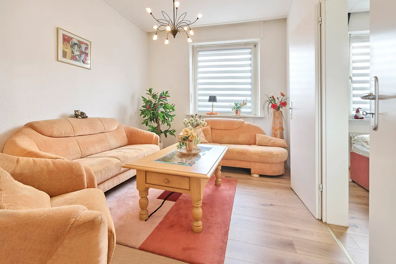 Die Wohnung im Erdgeschoss umfasst eine Wohnfläche von insgesamt rund 66 Quadratmetern und wurde bisher von der Eigentümerin selbst genutzt, sodass sie kurzfristig bezogen werden kann. Die Einheit verfügt über drei Zimmer, eine Küche und ein hell gefliestes Badezimmer. Ein besonderer Vorteil ist der direkt angrenzende Anbau, der sich ideal als Hobbyraum eignet. Zusätzlich gehört ein rund 20 Quadratmeter großer Raum auf der Zwischenetage zu dieser Wohnung, was die Flexibilität der Raumnutzung deutlich erhöht. Die Wohnung verfügt somit insgesamt über 86 Quadratmeter Wohnfläche.