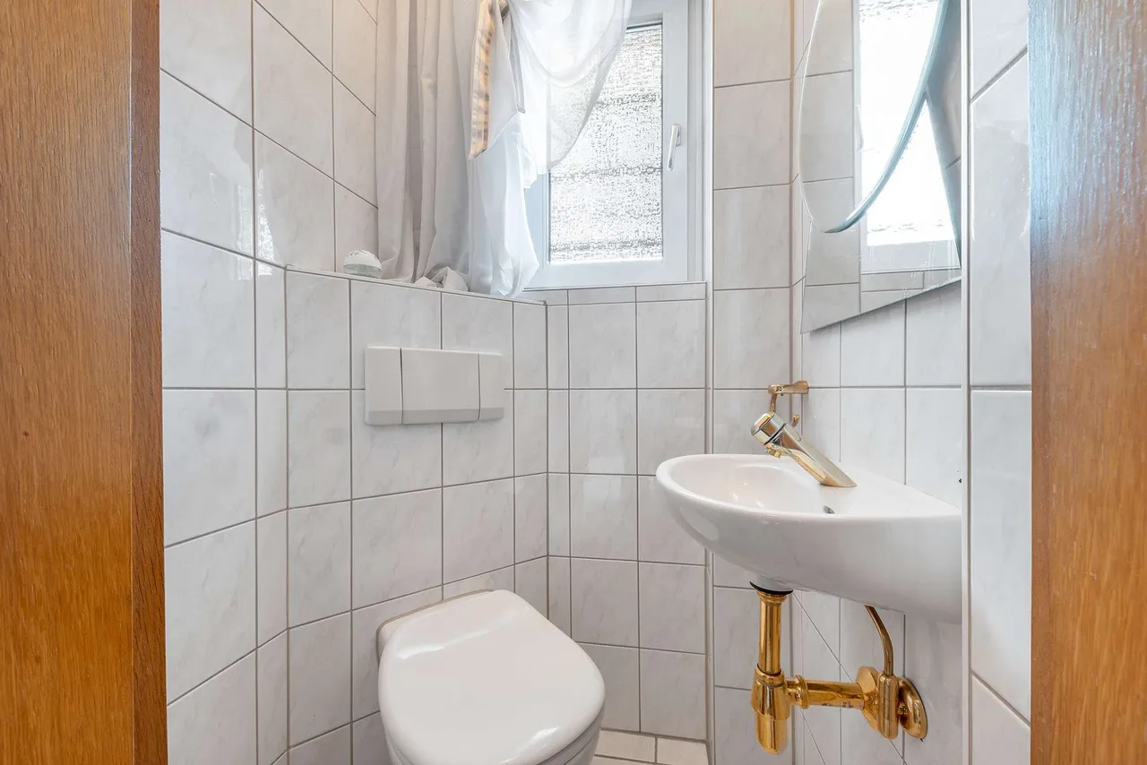Das Haus empfängt Sie mit einer klassischen Aufteilung: Im Erdgeschoss finden Sie das Gäste-WC und den gemütlichen Wohn-Essbereich mit Parkettboden. Das Obergeschoss beherbergt drei Schlafräume sowie das 2014 modernisierte Bad mit ebenerdiger Dusche und ein praktisches, separates WC (ebenfalls 2014 erneuert).
