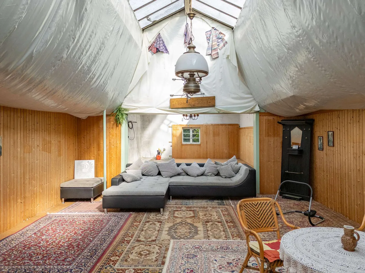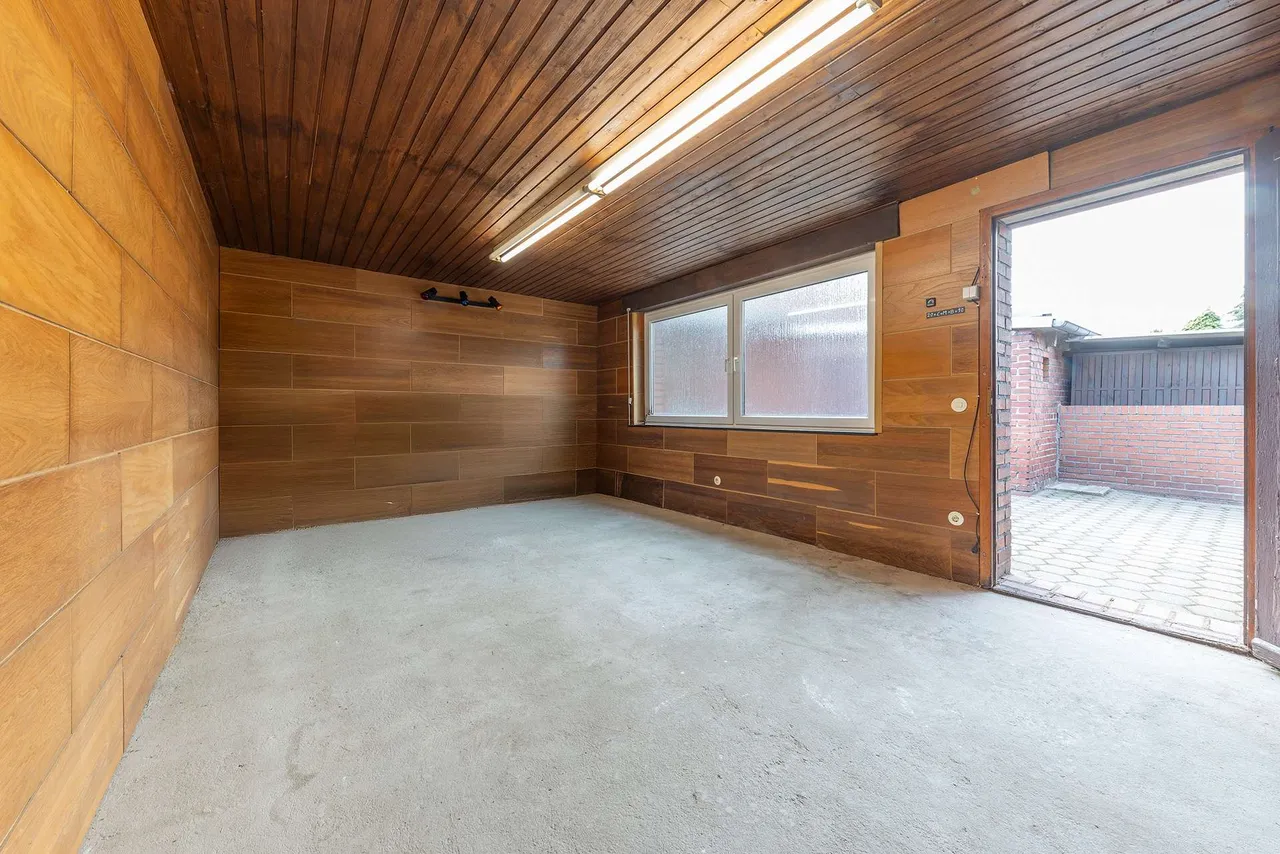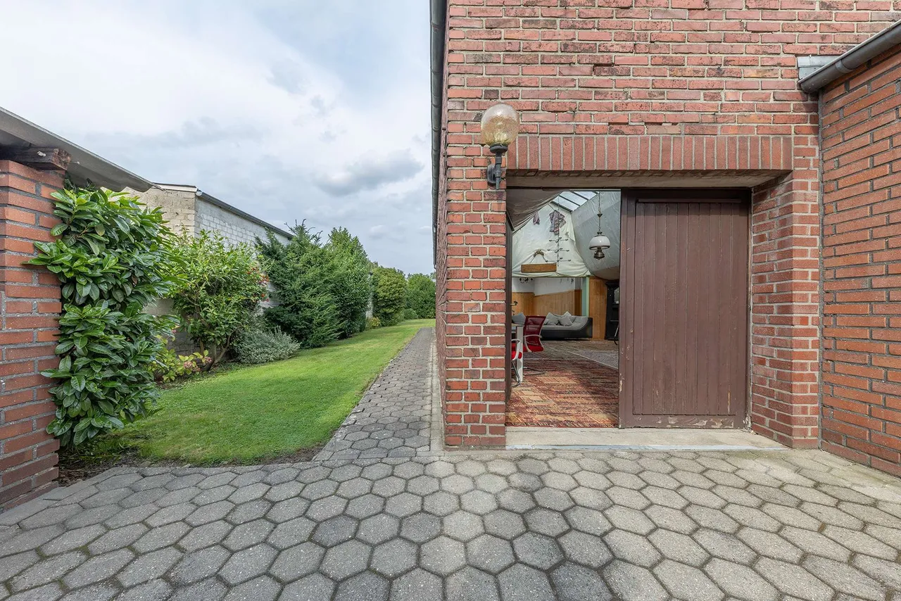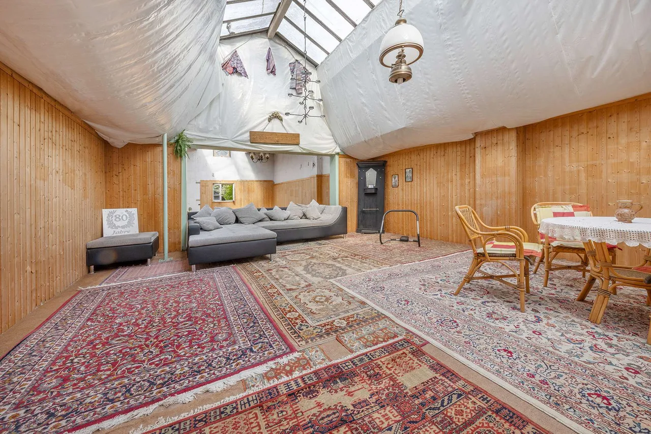 Das wahre Unikat dieses Anwesens ist die große, massive Halle im hinteren Grundstücksbereich – eine ehemalige Weberei. Sie bietet unglaubliches Potenzial für ein Atelier, eine Werkstatt, Hobbys oder ein Gewerbe. Eine Garage mit elektrischem Tor, weitere Schuppen und ein gemütlicher, überdachter Hof runden dieses seltene Angebot ab.